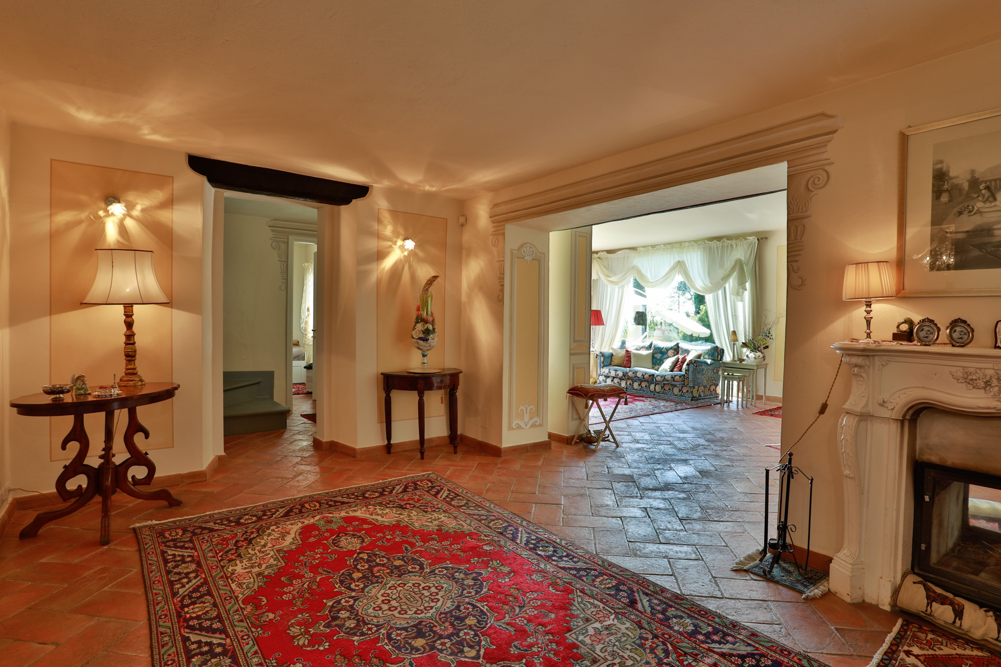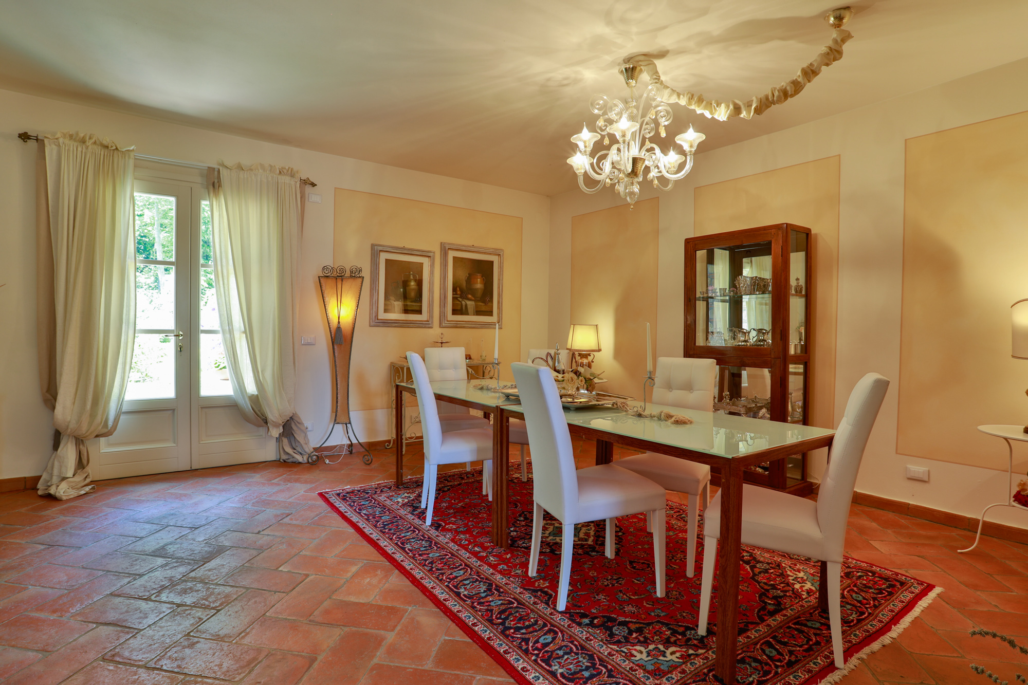 Il piano terra è composto dalla sala d’ingresso e sala da pranzo, soggiorno con camino e TV a schermo piatto, comodi divani e biblioteca. Impressionante le grandi porte di vetro e finestre che trasferiscono in questa stanza una luce speciale e fanno godere la vista del panorama esterno e anche della piscina. La cucina è completamente attrezzata e si collega con il patio esterno.
