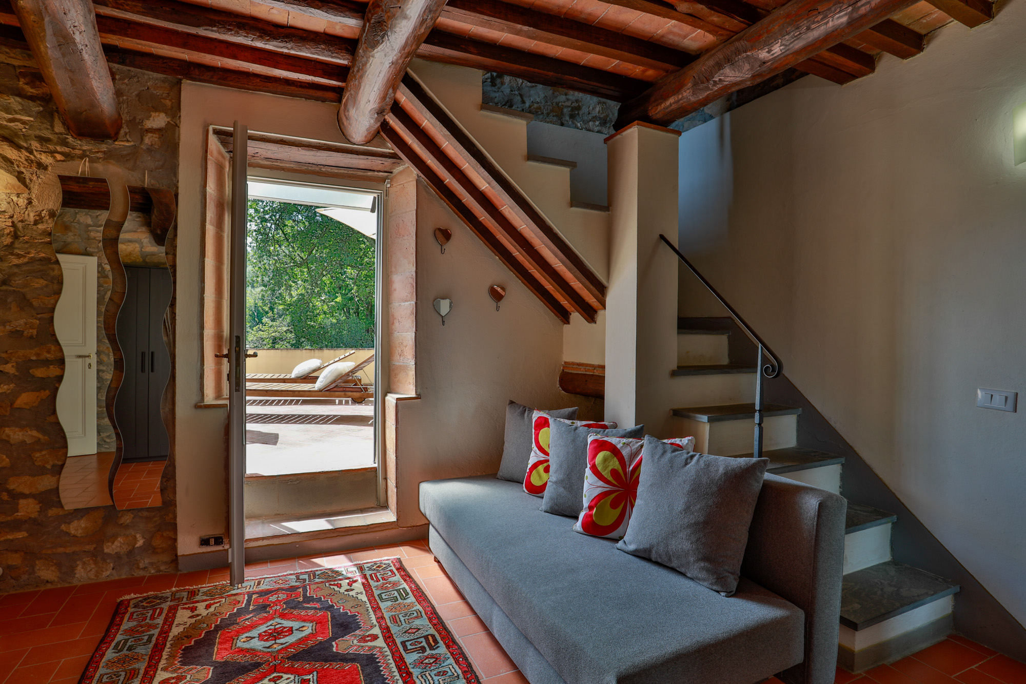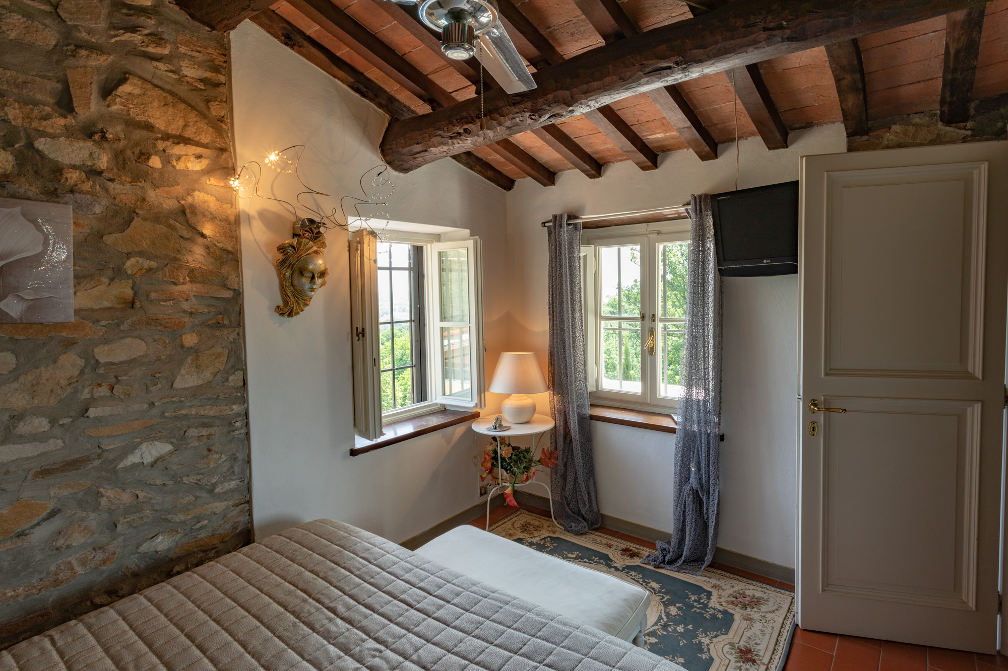 Dal primo piano a una piccola scalinata si può raggiungere la stanza più romantica della casa con 180 gradi di vista sul panorama.  Si tratta di una camera da letto matrimoniale con bagno privato con doccia.
